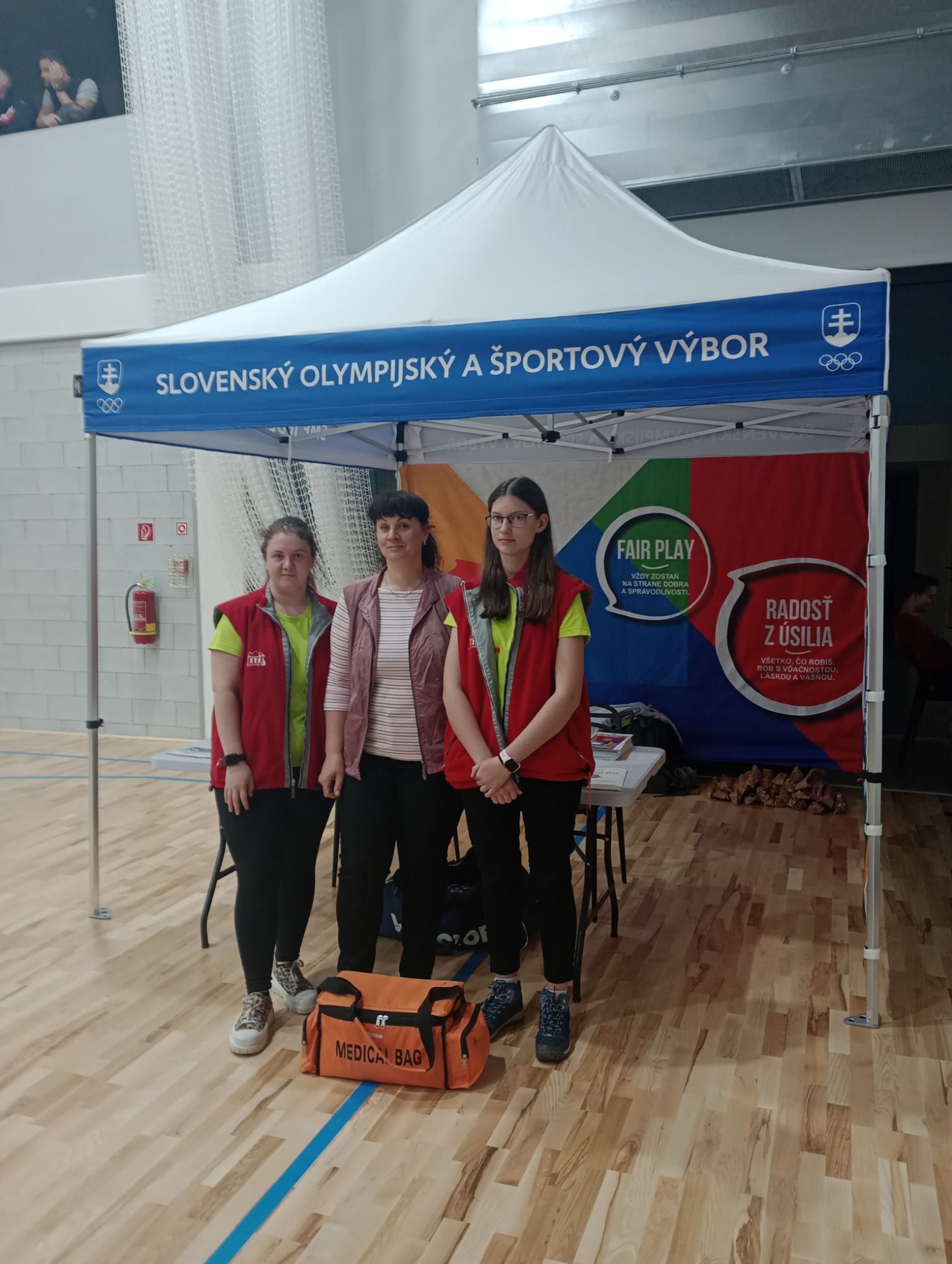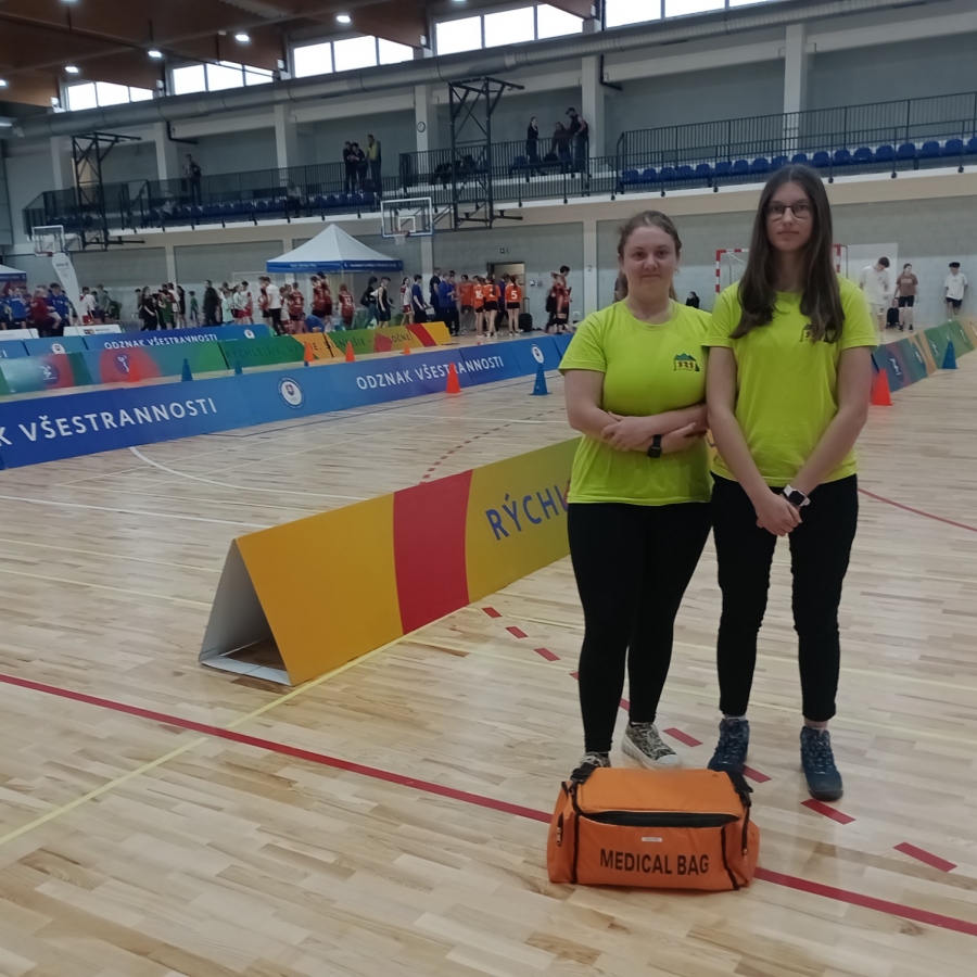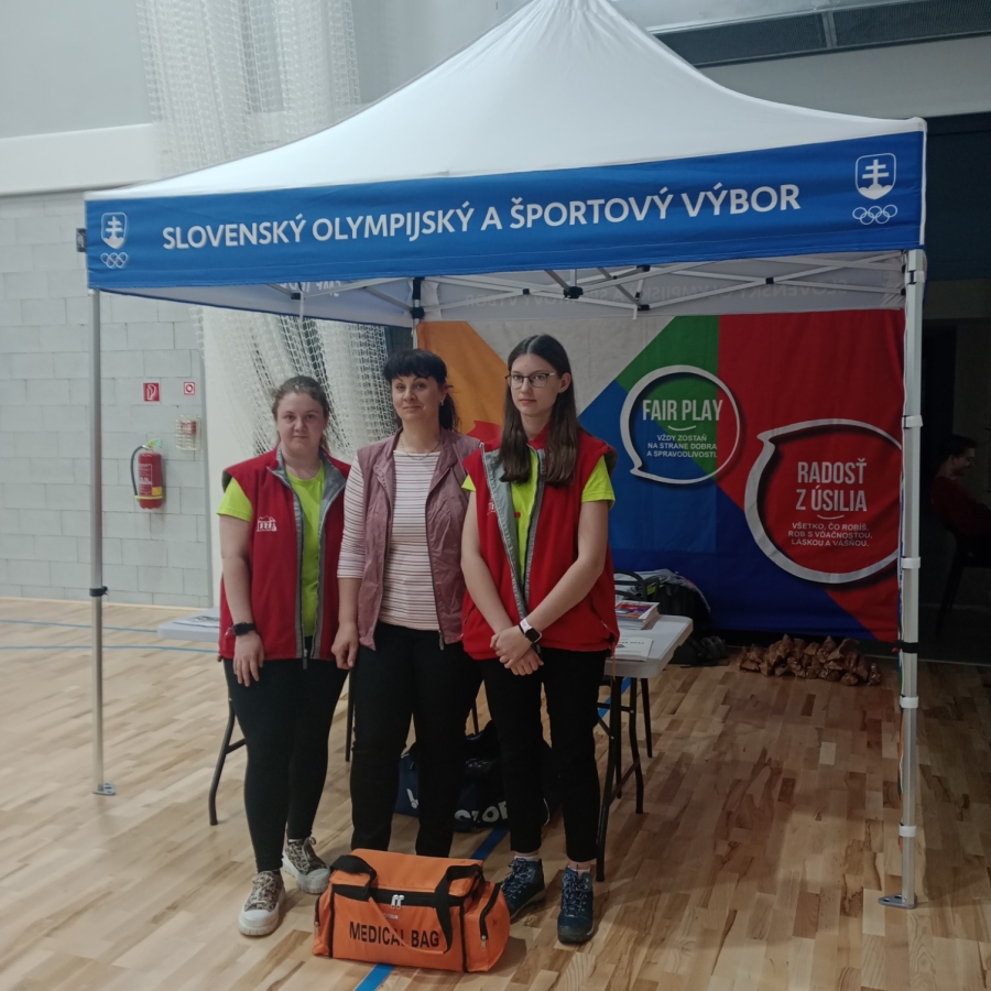 Naše žiačky S. Baková a K. Pajerová /2. PS B/ s vyučujúcou A. Takáčovou dňa 16.4.2024 vykonávali zdravotnícky dozor v rámci športovej súťaže, ktorú organizoval Slovenský olympijský a športový klub v priestoroch Strednej športovej školy. Túto súťaž absolvovalo cca 280 žiakov 6. – 9. ročníka základných škôl z Prešovského kraja. Našťastie sa nikto zo súťažiacich nezranil a nepotreboval poskytnúť základnú prvú pomoc. Naopak naše žiačky získali zase ďalšiu skúsenosť ako využiť získané vedomosti pri prezentácii našej školy pre možno budúcich prvákov SZŠ.