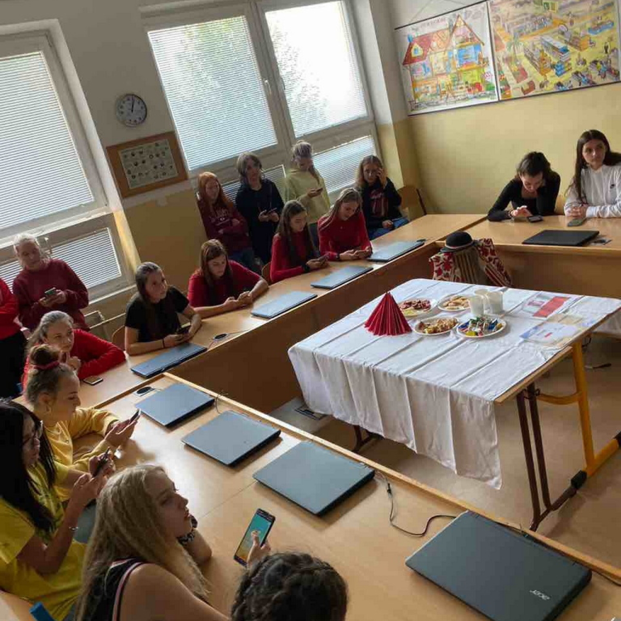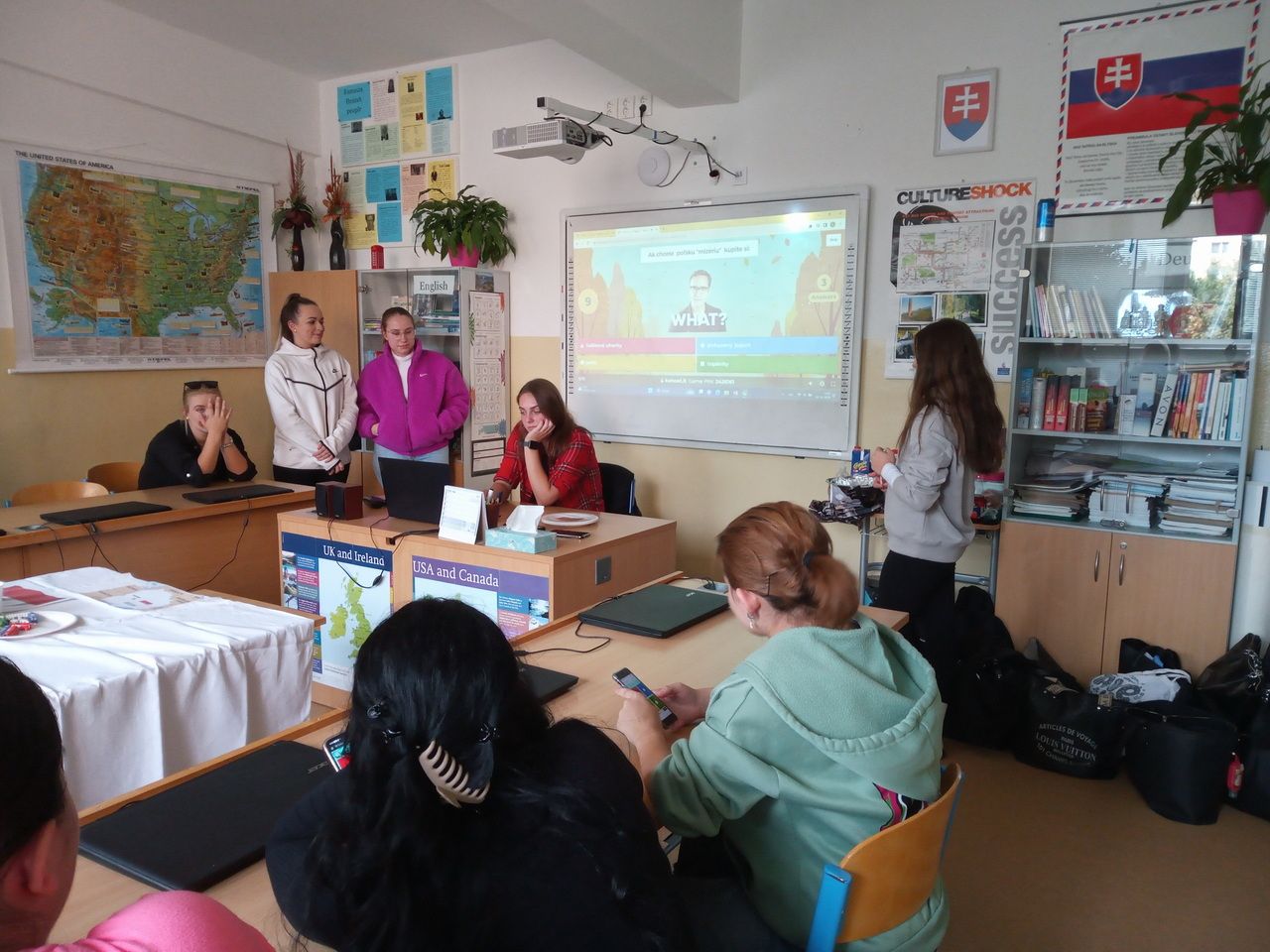Tento rok sme si v škole opäť pripomenuli Európsky deň jazykov. Každá trieda si vybrala krajinu, ktorej jazyk a zvyklosti nám bližšie predstavila. Prezentácie jednotlivých krajín boli spojené s ochutnávkou typických jedál, vedomostnými súťažami ale aj tancom.