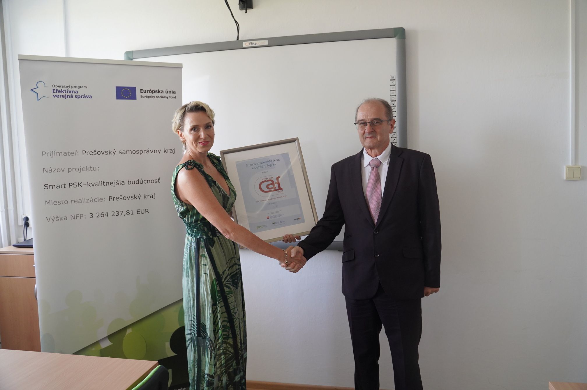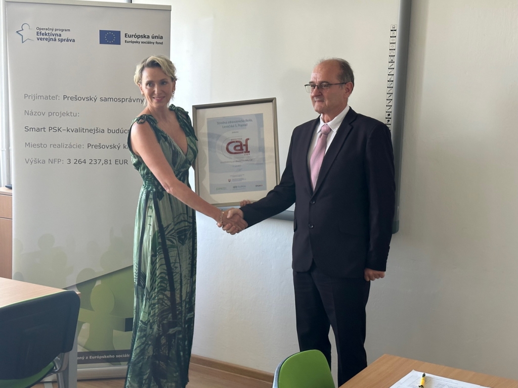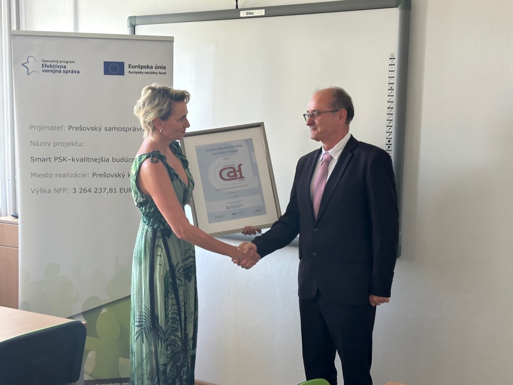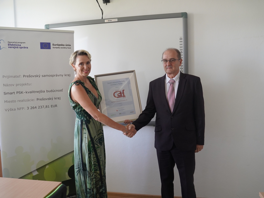 V stredu, 7. septembra za účasti vedúceho odboru školstva PaedDr. Jána Furmana a predsedníčky Úradu pre normalizáciu, metrológiu a skúšobníctvo SR Kataríny Surmíkovej Tatranskej, si riaditeľ Mgr. Miroslav Bednár prevzal ocenenie dvojročnej práce celej školy vo forme ocenenia EFEKTÍVNY POUŽÍVATEĽ MODELU CAF.