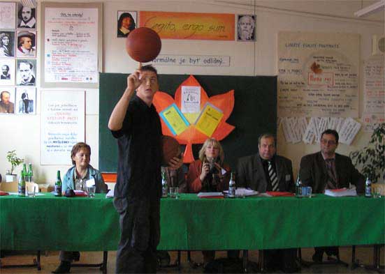 Súťaž sa oficiálne začala o desiatej hodine. Program spestrili naša šéfredaktorka Andrea spolu s Mirkou, no a akáže by to bola akcia na pôde SZŠ bez žonglérskeho umenia Paľa Rusňáka. Andrea doslova ohromila porotu svojím nádherným spevom za kvalitného doprovodu Mirky na akordeóne. Naši konkurenti, ktorí zastupovali svoje časopisy boli samé baby (no až na jedného mladého profáka z Michaloviec).