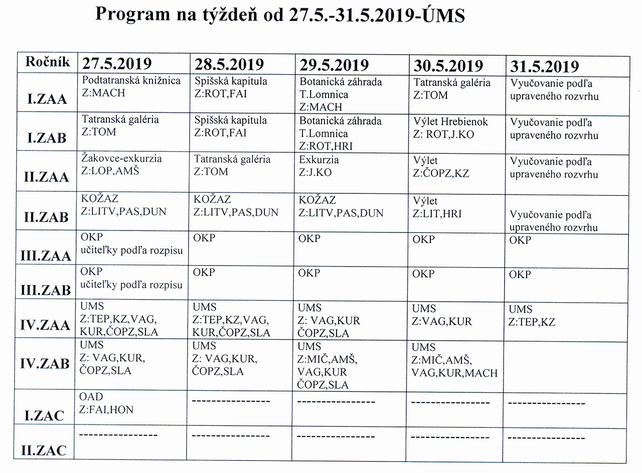 Počas maturitných skúšok je rozvrh pre triedy prvého a druhého ročníka na priloženom dokumente. Žiaci tretieho ročníka vykonávajú súvislú mesačnú prax. Maturantom želáme úspešné zvládnutie maturitných skúšok.