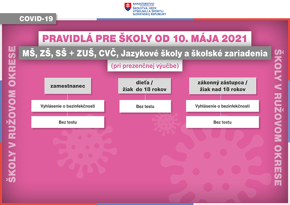 Od pondelka 10.mája 2021 je naša škola "v ružovom okrese". Škola sa riadi vecami podľa infografiky MŠ SR.