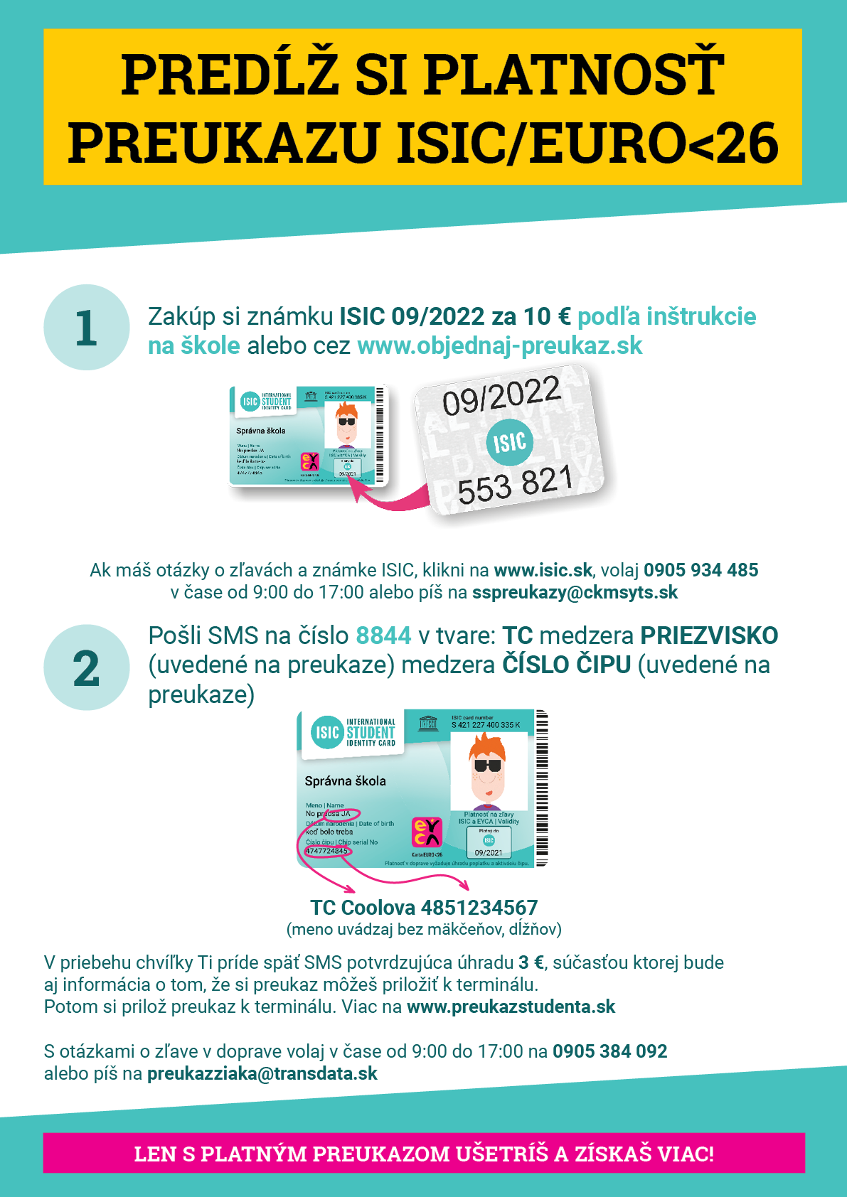 Nastal čas, kedy je potrebné si predĺžiť platnosť preukazu ISIC a dopravnej licencnie pre potreby Vášho cestovania aj počas prázdnin. Nakoľko je na Slovensku mnoho dopravcov, ktorí si vykladajú pravidlá po svojom, je potrebné pre bezproblémové cestovanie urobiť nasledovné: