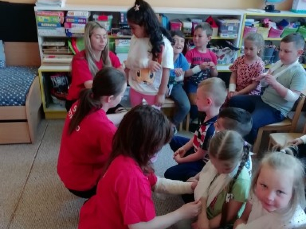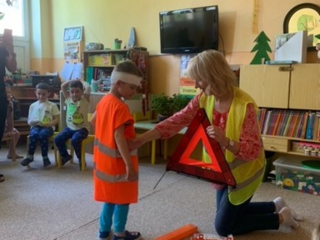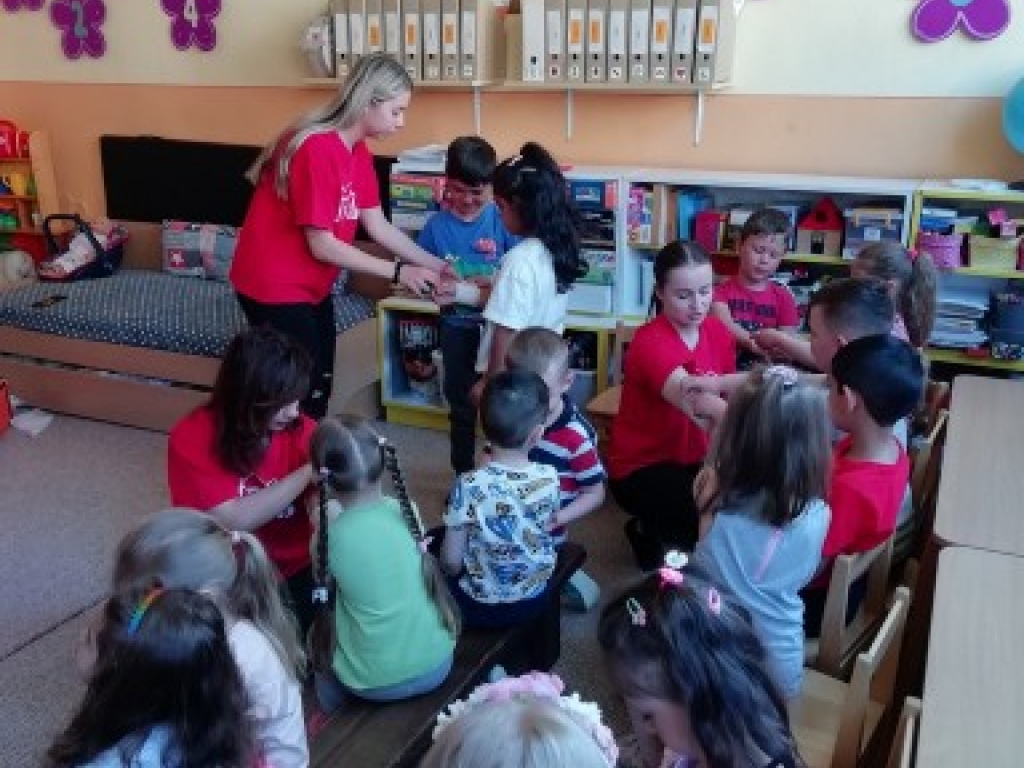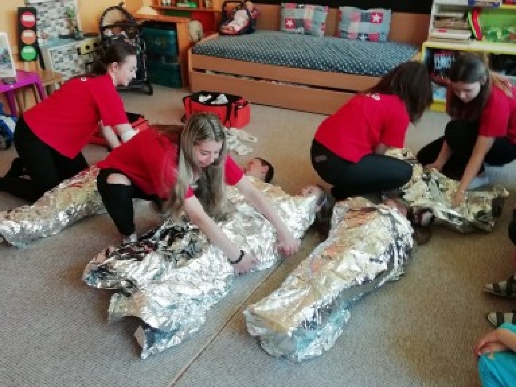 Vo štvrtok, 12. mája 2022, sme navštívili so študentkami 4.B Viktóriou, Natáliou, Karin a Natáliou v materskej škôlke Veľký Slavkov našich najmenších a predviedli im ukážky prvej pomoci pri dopravných nehodách. Vyskúšali sme si ako sa majú správať, aby to bolo bezpečné na cestnej premávke a ako sa ošetrujú najčastejšie poranenia pri páde na bicykli alebo kolobežke.