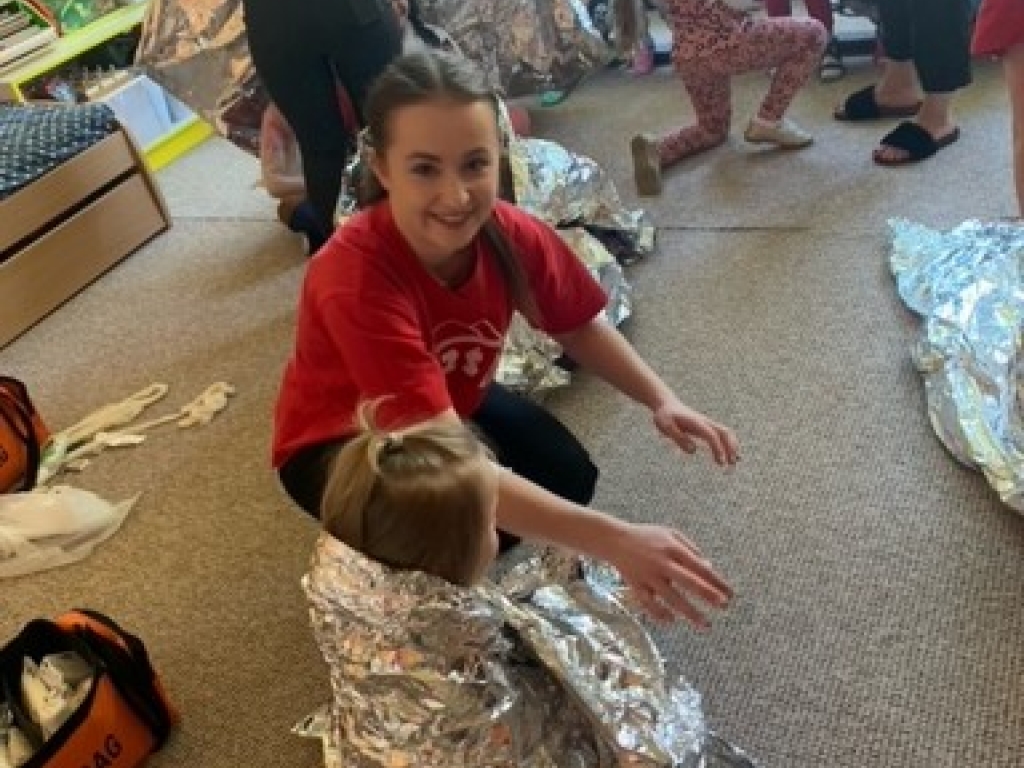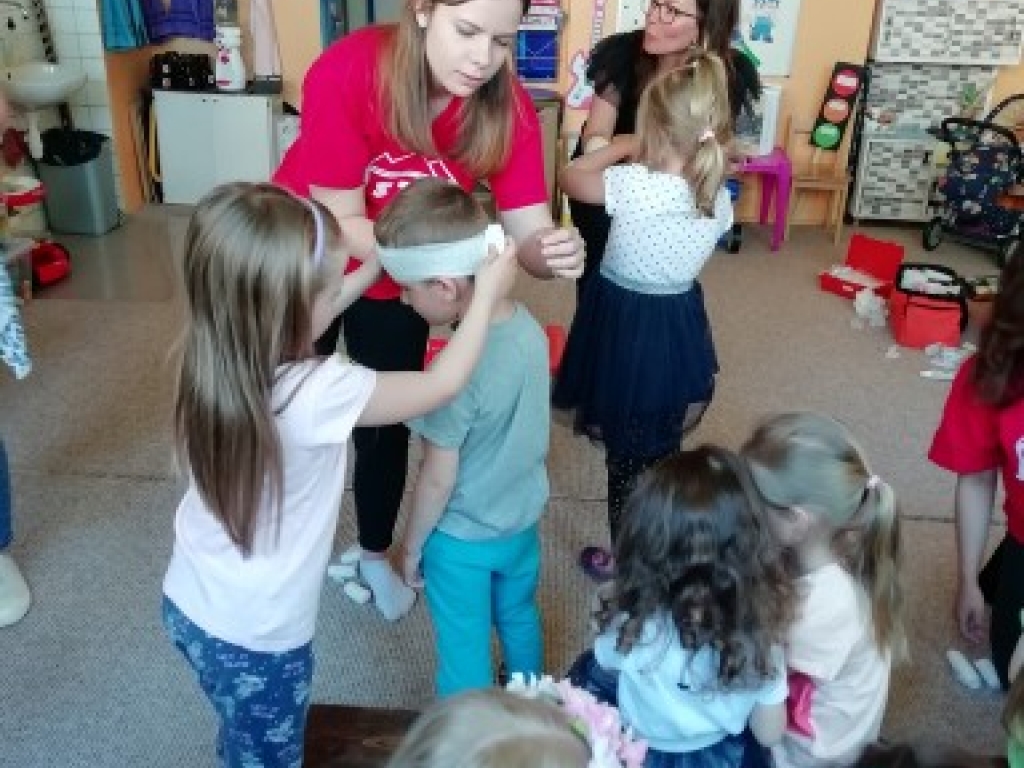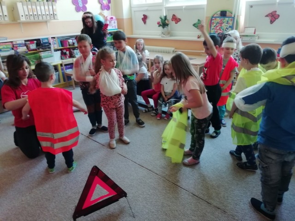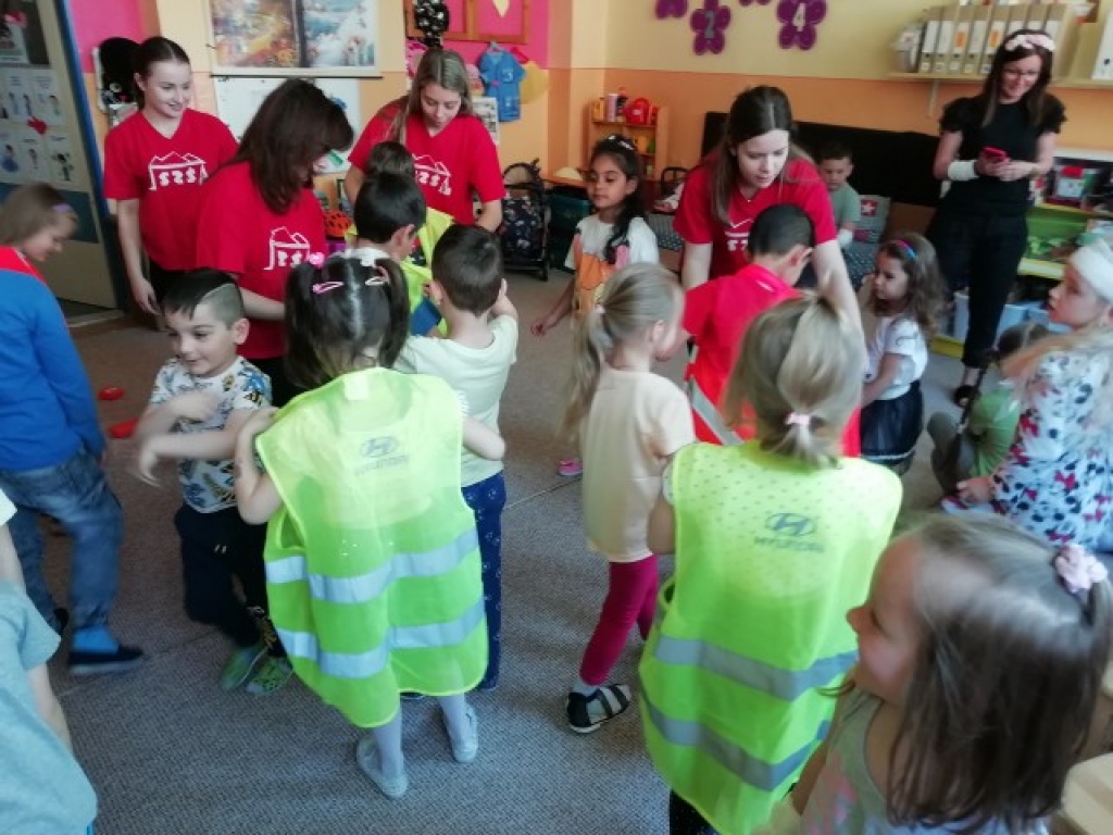 Vo štvrtok, 12. mája 2022, sme navštívili so študentkami 4.B Viktóriou, Natáliou, Karin a Natáliou v materskej škôlke Veľký Slavkov našich najmenších a predviedli im ukážky prvej pomoci pri dopravných nehodách. Vyskúšali sme si ako sa majú správať, aby to bolo bezpečné na cestnej premávke a ako sa ošetrujú najčastejšie poranenia pri páde na bicykli alebo kolobežke.