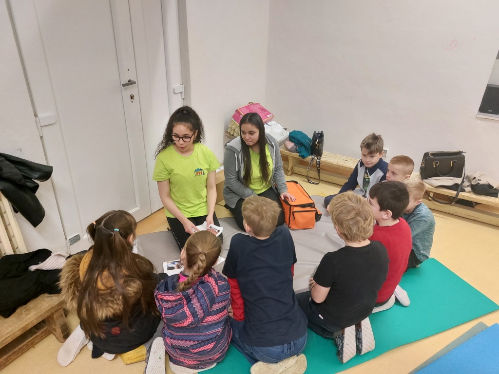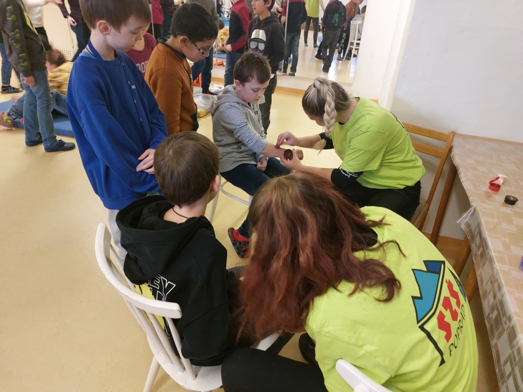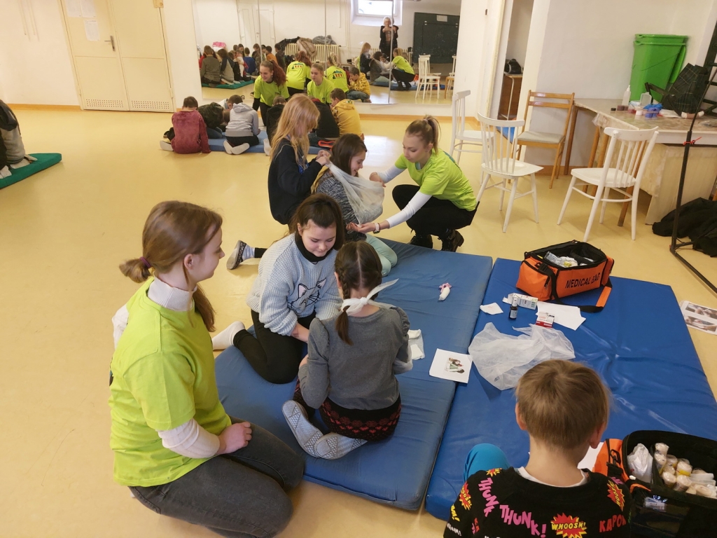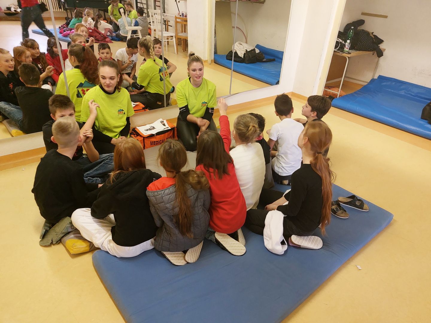 Naše dievčatá z II. A predviedli žiakom prvého stupňa v ZŠ Komenského Svit ukážky a nácvik prvej pomoci pri krvácaní, odreninách, zlomeninách a tiež ako správne privolať pomoc.