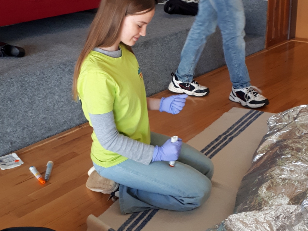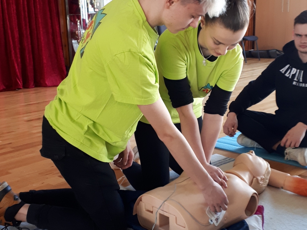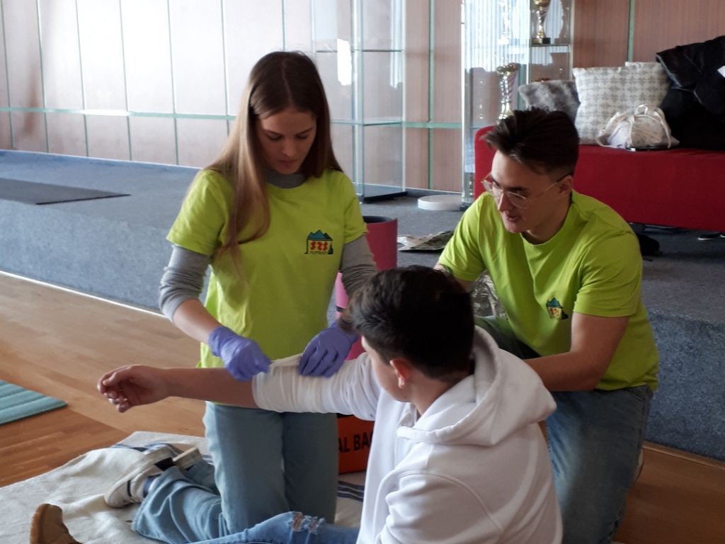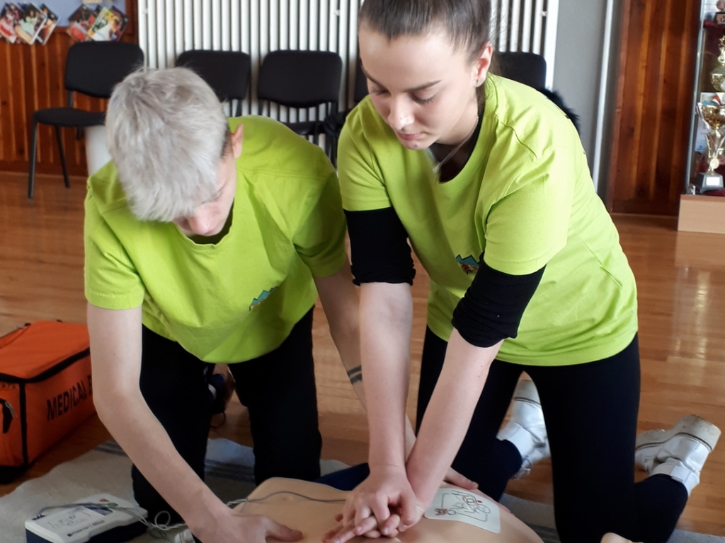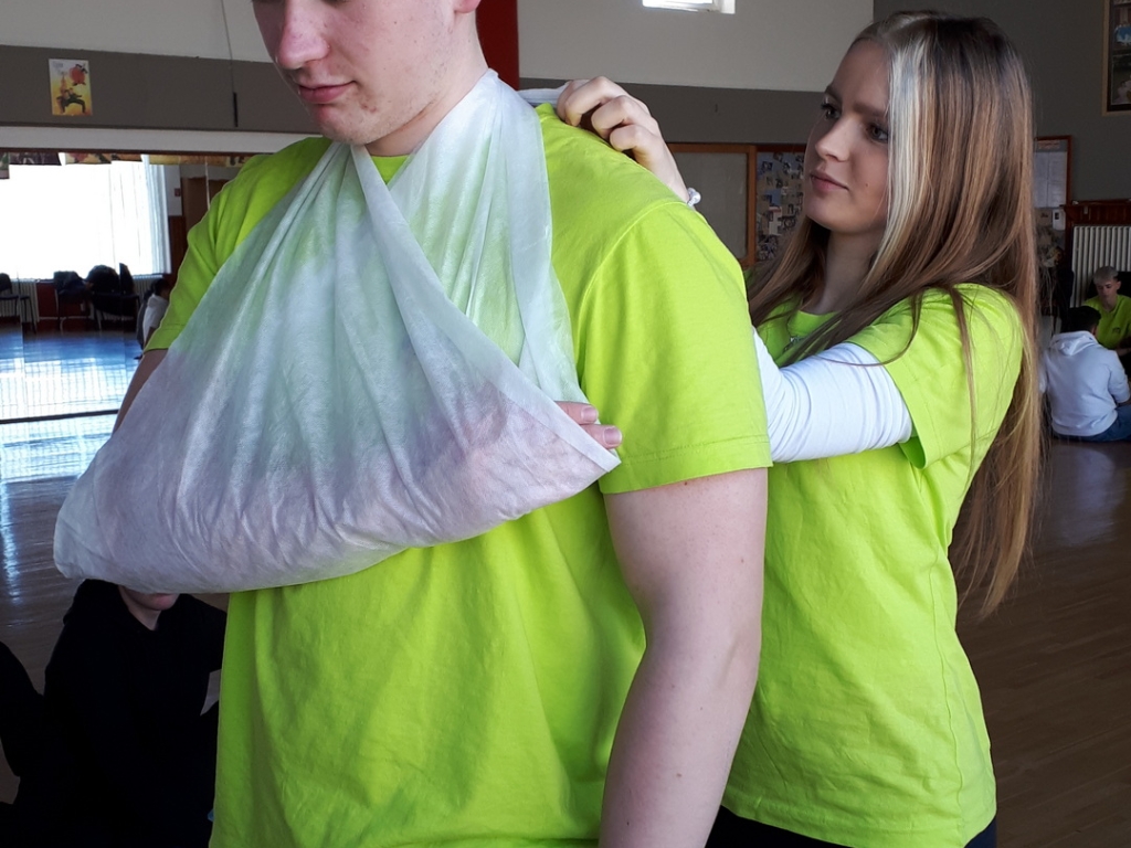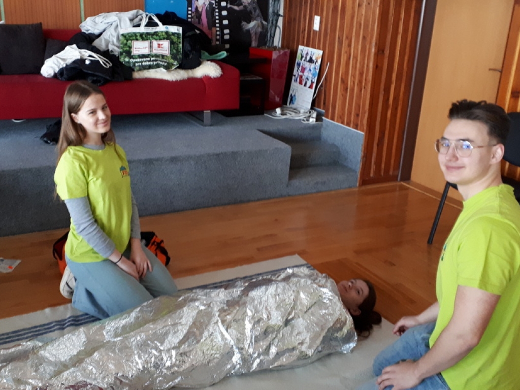 žiaci 3.A triedy Samuel, Markus, Damián spolu so žiačkami 2.B triedy Henrietou, Editou a Emmkou predviedli základné postupy prvej pomoci pri ohrození života na SOŠ Okružná, Poprad.