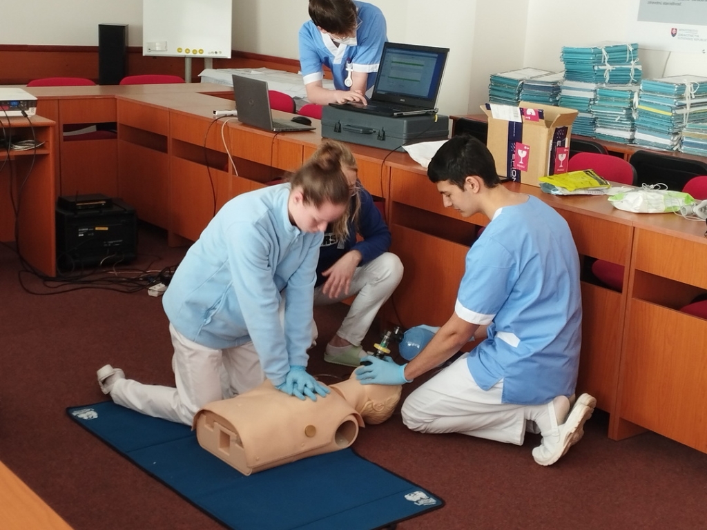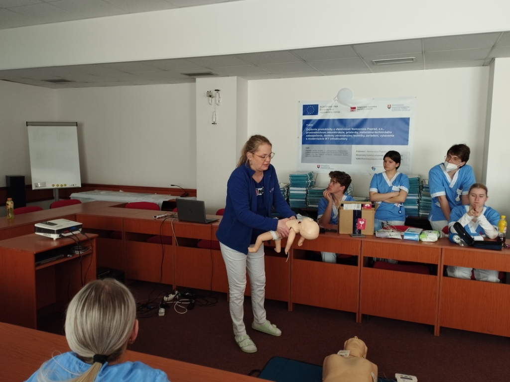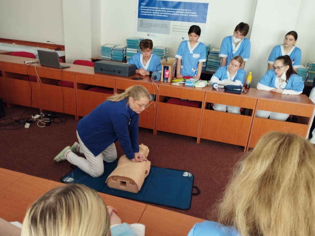 Keď nám námestníčka ošetrovateľstva Zuzana Guttová navrhla účasť na školení KPR, ktoré organizuje nemocnica na preškolenie svojich zamestnancov nemohli sme odmietnuť. Počas troch hodín intenzívneho seminára sme si zopakovali, zdokonalili a upevnili vedomosti z resuscitácie pacienta a základnej prvej pomoci. Odborné zabezpečenie školenia zabezpečila dlhoročná zamestnankyňa, certifikovaná školiteľka - sestra Eva Andrusová. Jej dlhoročné praktické skúsenosti na ARE a traumatologickej JIS prirodzene pretavila do školenia. Sme nesmierne hrdí, že nemocnica oslovila s ponukou školenia aj našich žiakov. Opakovanie je matka múdrosti a predsa len je evidentný rozdiel medzi teóriou a praxou....