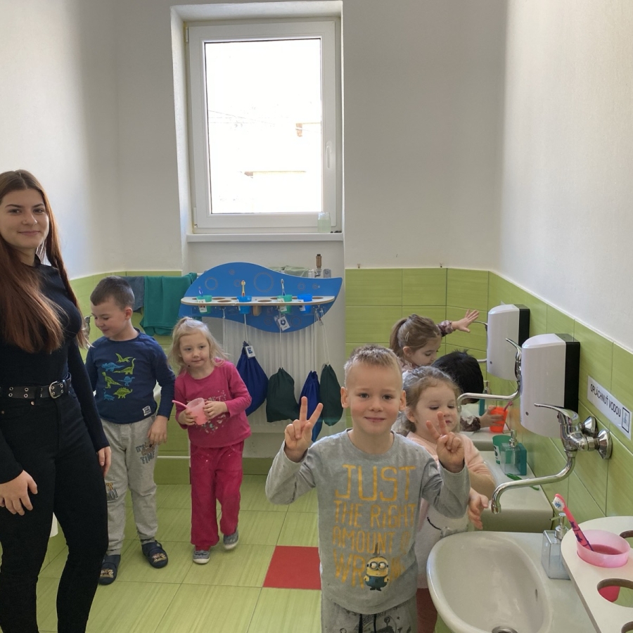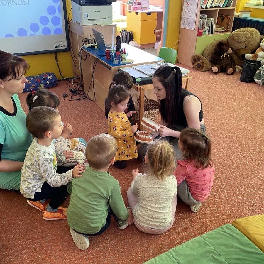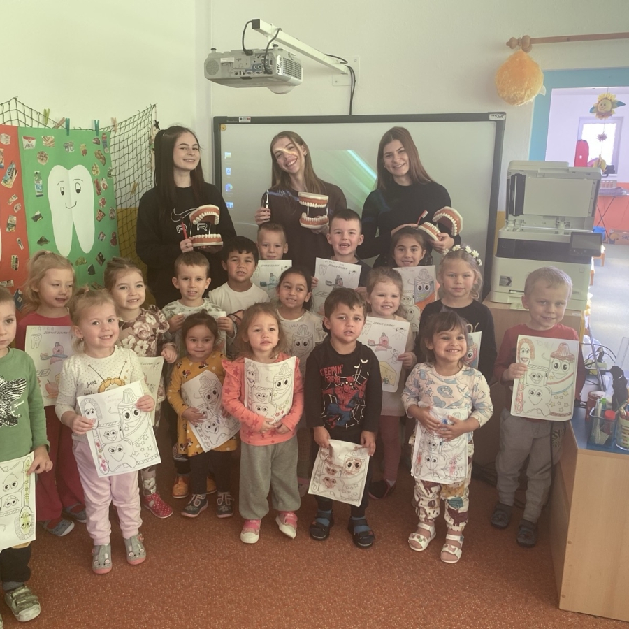 Naše študentky 1. PS B triedy / V. Guzlejová, L. Kolbová, A. Petríková / navštívili MŠ Kravany v rámci projektu Zdravotná výchova, kde sa snažili detičkám hravou formou poukázať na význam starostlivosti o mliečne zúbky. Poskytli im základné vedomosti o zúbkoch, vysvetlili im význam zdravej výživy pre trvalé zúbky, vhodné a nevhodné potraviny ako aj správne postupovať pri ich čistení. Názorne im ukázali a precvičili základné postupy umývania zúbkov. Dievčatá si pripravili pútavú prezentáciu a vhodný materiál k danej téme. Detičkám sa veľmi páčili zúbkové omaľovánky a potrebné pomôcky / zubná niť, medzizubné kefky, špeciálne kefky jednoštetinkové / k umývaniu zúbkov. Ako sme sa dozvedeli z rozhovoru, aj k nim chodí zúbková víla pri strate mliečneho zúbka .....