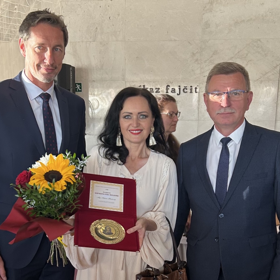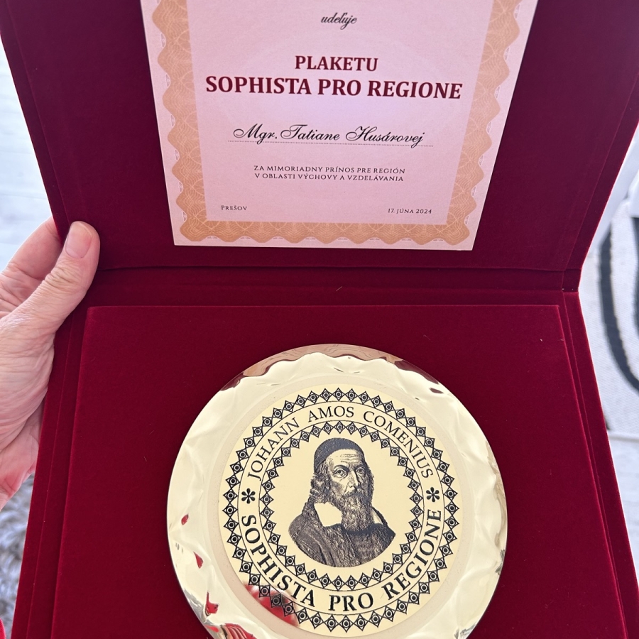 Prešovský samosprávny kraj každoročne oceňuje plaketou Jána Amosa Komenského výnimočných pedagógov škôl, ktorí svojou činnosťou významným spôsobom ovplyvnili aktivity žiakov a prispeli tak k šíreniu pozitívneho mena školy. 17. júna 2024 sa v Divadle Jonáša Záborského v Prešove konal už 14. ročník slávnostného odovzdávania ocenení. Za mimoriadny prínos pri výchove a vzdelávaní žiakov si z rúk predsedu PSK Milana Majerského prevzala plaketu Sophista pro regione naša učiteľka anglického jazyka Mgr. Tatiana Husárová. Pedagogický zbor Strednej zdravotníckej školy v Poprade obohatila svojím nevšedným a veľmi kreatívnym prístupom vo vzdelávaní cudzieho jazyka a bohatou a pestrou mimoškolskou činnosťou, v rámci ktorej dokáže odhaliť i skrytý potenciál študenta. Ako skúsená učiteľka pristupuje k svojim žiakom ako k jedinečným a výnimočným sobnostiam, svojím zanietením a empatickým vnímaním dokáže prebudiť i prejaviť ich schopnosti, vie, že na formovanie myslí mladých ľudí je potrebné veľké srdce. Toto prestížne ocenenie Sophista pro regione – učiteľ múdrosti pre región si Tatiana Husárová právom zaslúži, nakoľko o jej práci hovoria veľmi úspešné projekty, ktoré zrealizovala. „Keď vzdelávame mysle mladých, nemali by sme zabudnúť vzdelávať aj ich srdcia,“ povedal Dalajláma a týmito slovami sa riadi aj Tatiana Husárová. Naša škola sa môže pýšiť i šikovnými žiakmi, a preto na ocenenie Lux mentium – svetlo poznania bola nominovaná Petra Pristašová zo 4. B za poskytnutie prvej pomoci neznámemu pánovi na ulici.