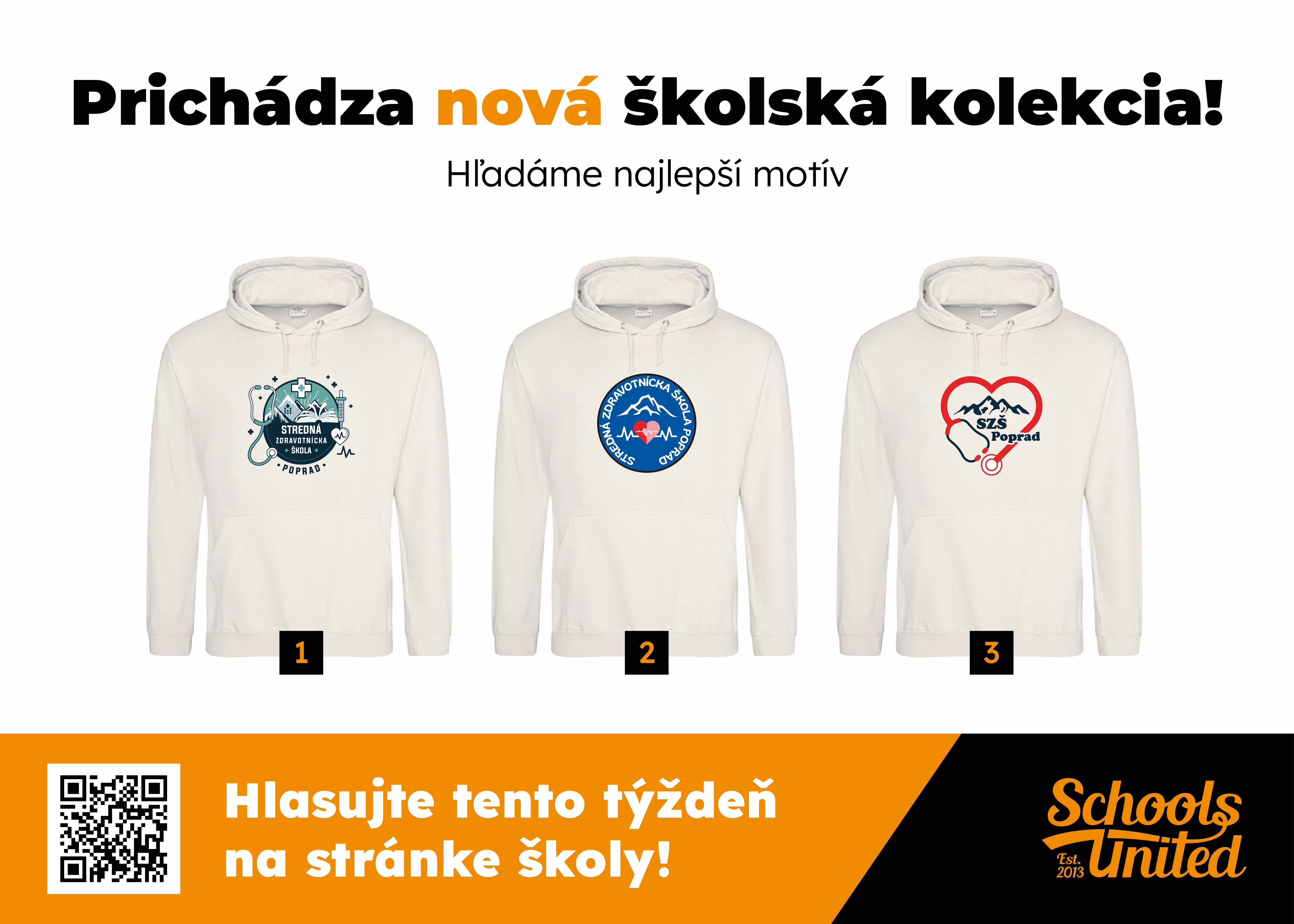 spolupráca Školského parlamentu a spoločnosti Schools United prináša svoje ovocie. Máme pre Vás skvelé prekvapenie! Do školy prichádza nová školská kolekcia oblečenia a ste to práve Vy, kto rozhodne o jej podobe! Hlasujte do 25.11.2024 o tom, ktorý z troch motívov navrhnutý našimi študentmi sa Vám páči najviac. Vyberte si motív, zadajte požadované údaje a do mailu Vám príde správa, ktorú potvrdíte, aby sa Váš hlas započítal. Víťazný motív potom použijeme na vytvorenie celej kolekcie, kde nájdete nielen mikiny a tričká, ale aj tepláky, batohy, čiapky a ďalšie kúsky. Hlasovanie je spustené len na 10 dní, tak neváhajte a zapojte sa!