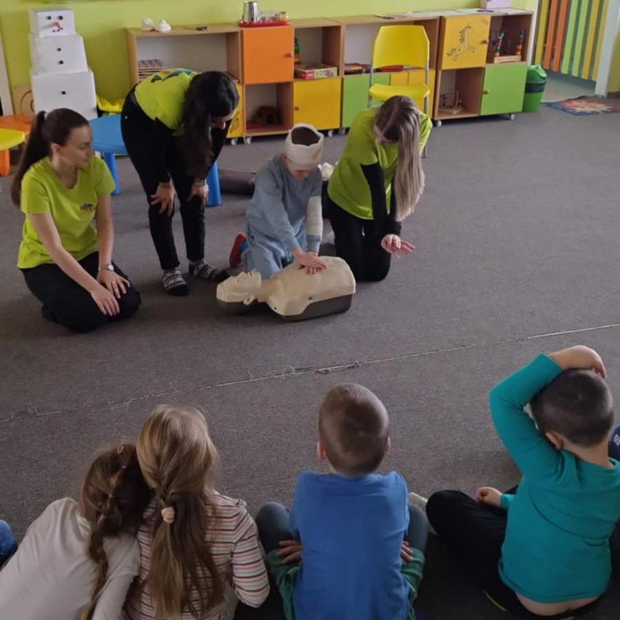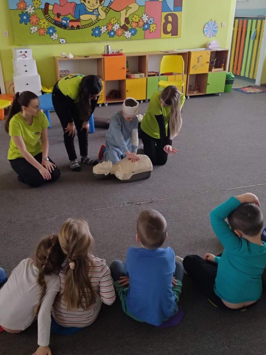V rámci nášho krúžku sme navštívili deti v MŠ Tajovského v Poprade, kde sme uskutočnili ukážky prvej pomoci, obväzovej techniky, zdravotnej výchovy pre deti predškolského veku. Hravou a pútavou formou pomocou obrázkov sme sa pýtali na úrazy, imitovali malé rany, ktoré deti ošetrovali, skúšali si záves hornej končatiny, ošetrenie zlomenín, v rámci prevencie šoku sme prezentovali zábal do izotermickej fólie, ale aj nácvik kardiopulmonálnej resuscitácie (KPR). Najväčšou odmenou pre nás bolo, že deti reagovali veľmi pohotovo, neboli ľahostajné, naopak zvedavé, chcú pomáhať. Našim cieľom bolo, aby si deti už od útleho detstva budovali k záchrane života pozitívny vzťah a neboli ľahostajní voči svojmu okoliu, aby už v útlom detstve dokázali pomôcť svojmu kamarátovi či blízkemu, ak sa niečo stane.