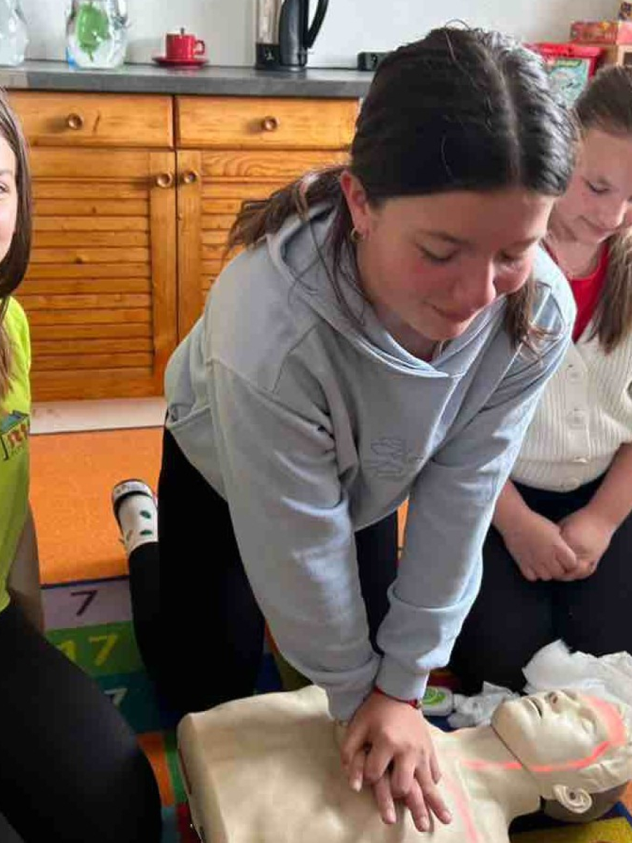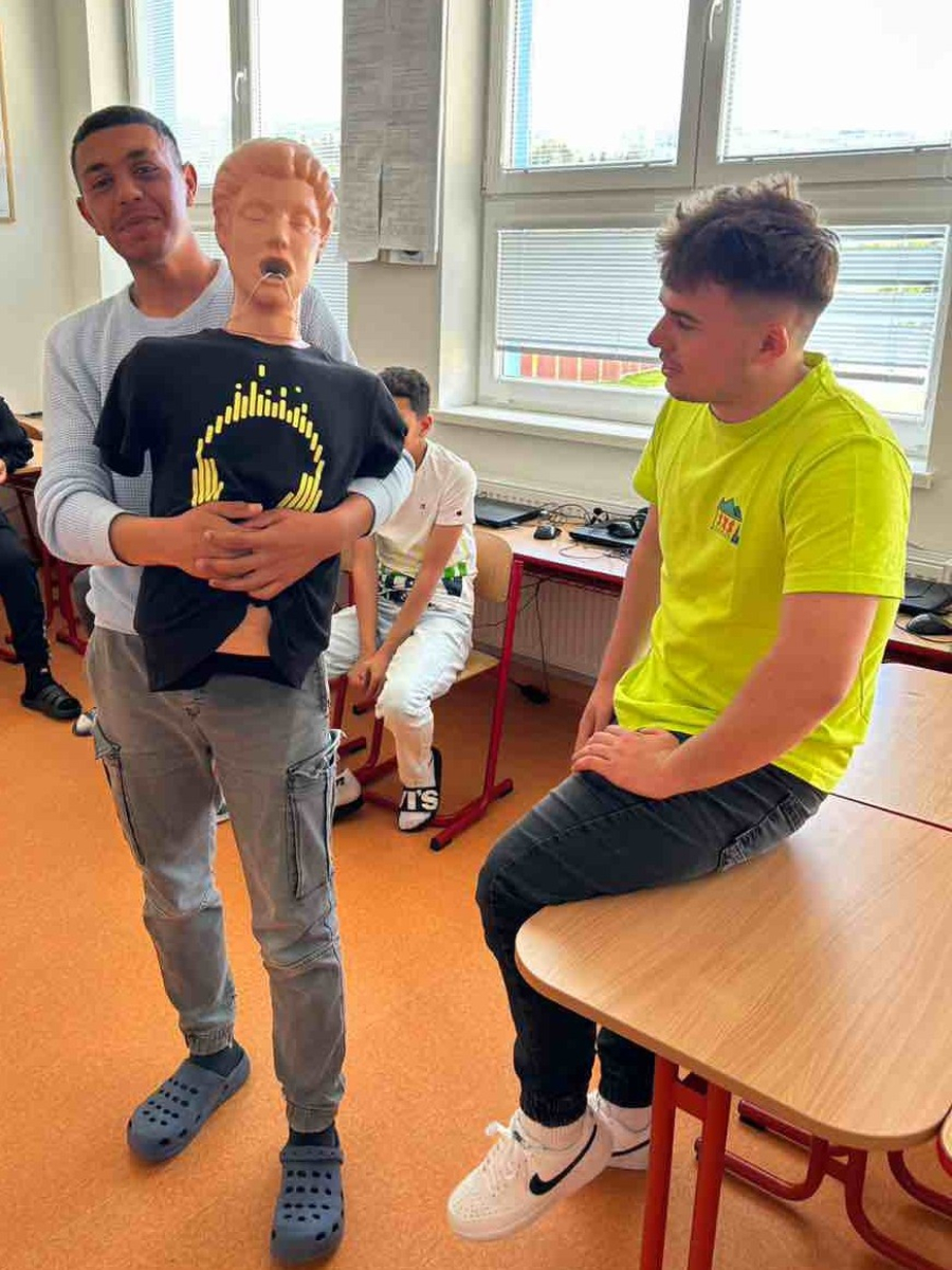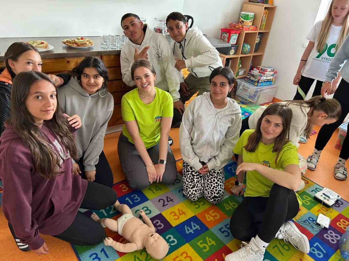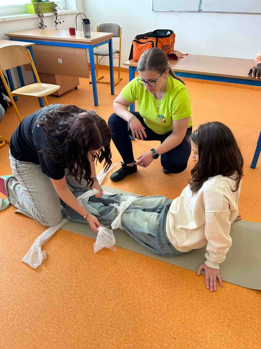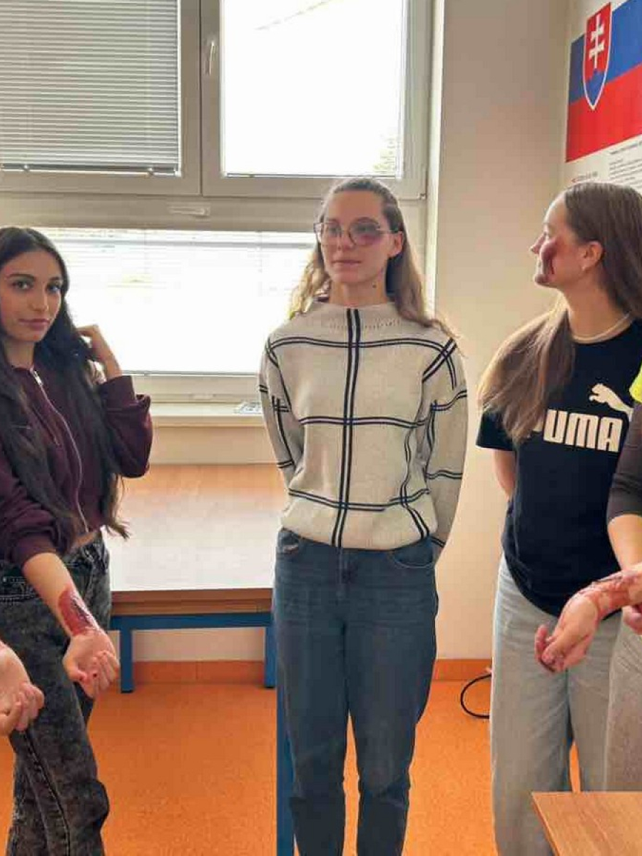 Tea Knapíková, Lea Kolbová, Mária Gondeková, Viktória Guzlejová, M. Sitiarik a Monika Petrenková navštívili v utorok 19.5.2025 žiakov druhého stupňa ZŠ s MŠ vo Vikartovciach. Ich úlohou bolo názorne a prakticky ukázať základy prvej pomoci - ako správne postupovať v stavoch ohrozujúcich život a ako privolať záchrannú službu. Žiaci si prakticky vyskúšali kardiopulmonálnu resuscitáciu (KPR), Heimlichov manéver, Gordonov úder – prvá pomoc pri dusení, ošetrenie tepnového krvácania, otvorenej zlomeniny a stabilizovanú polohu. Veľký záujem bol aj o maskovanie poranení, hlavne odreniny, hematómy, tržné rany a krvácanie z nosa, kde sa dievčatá mohli realizovať.