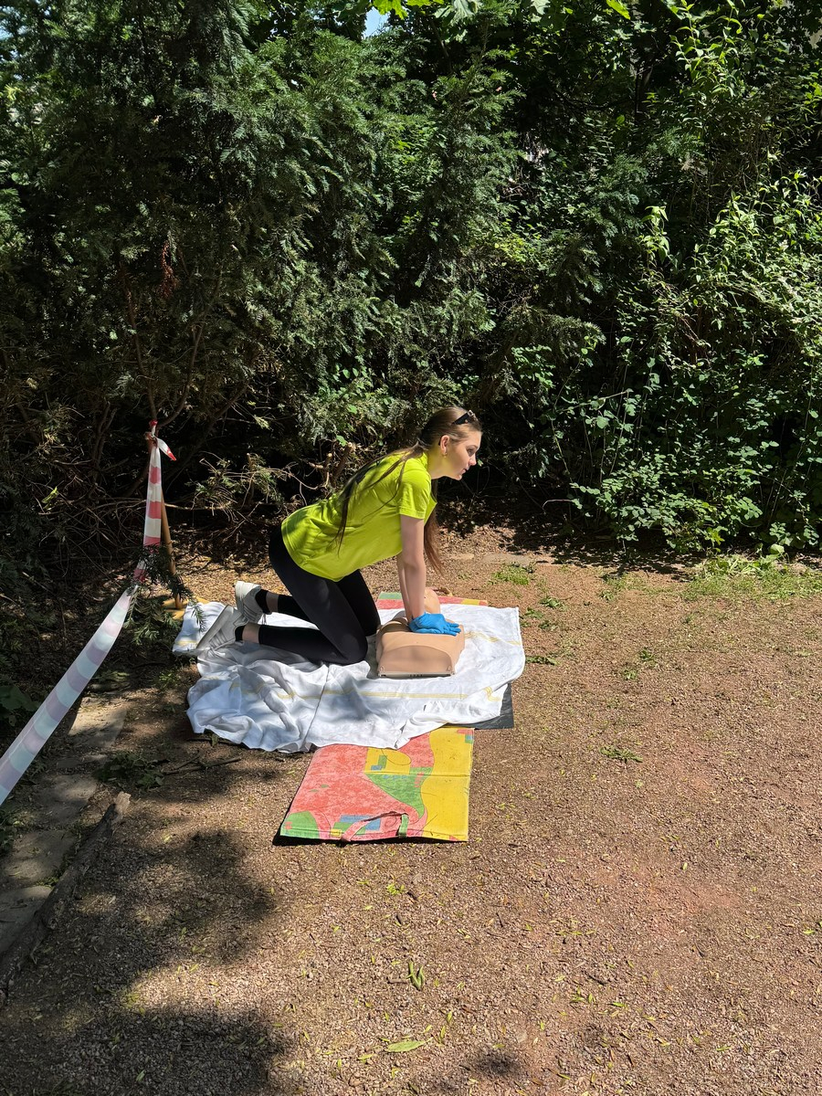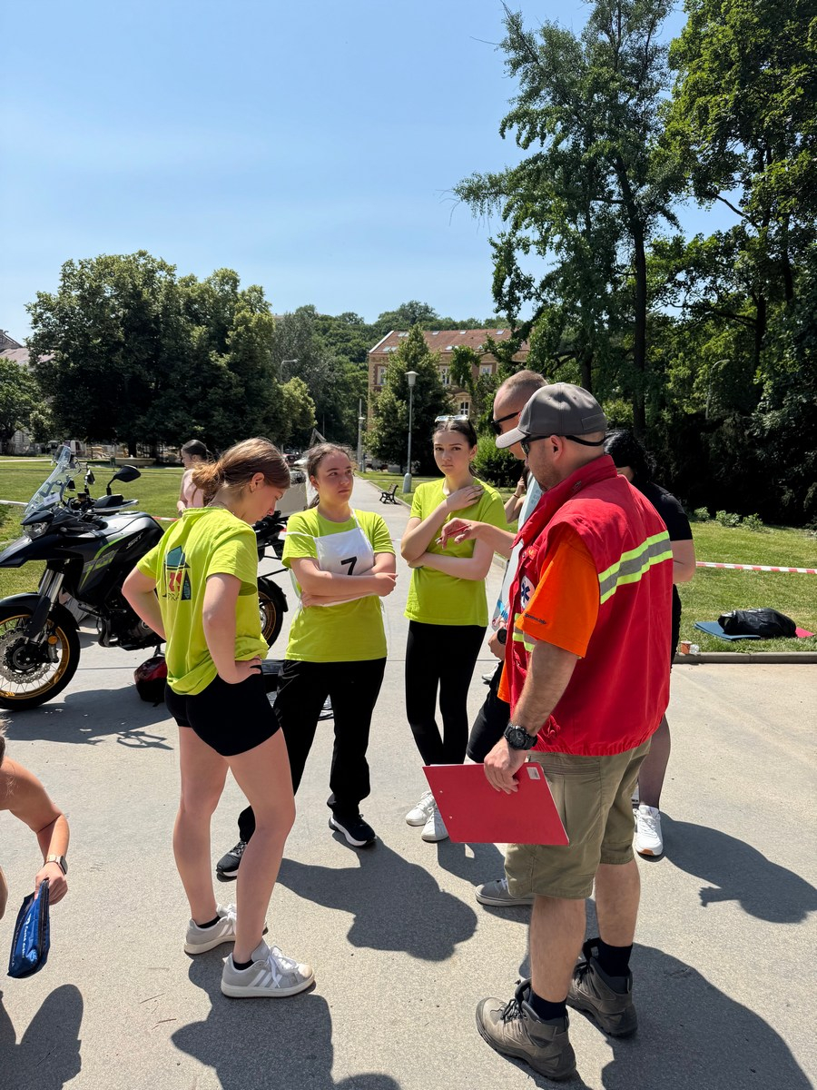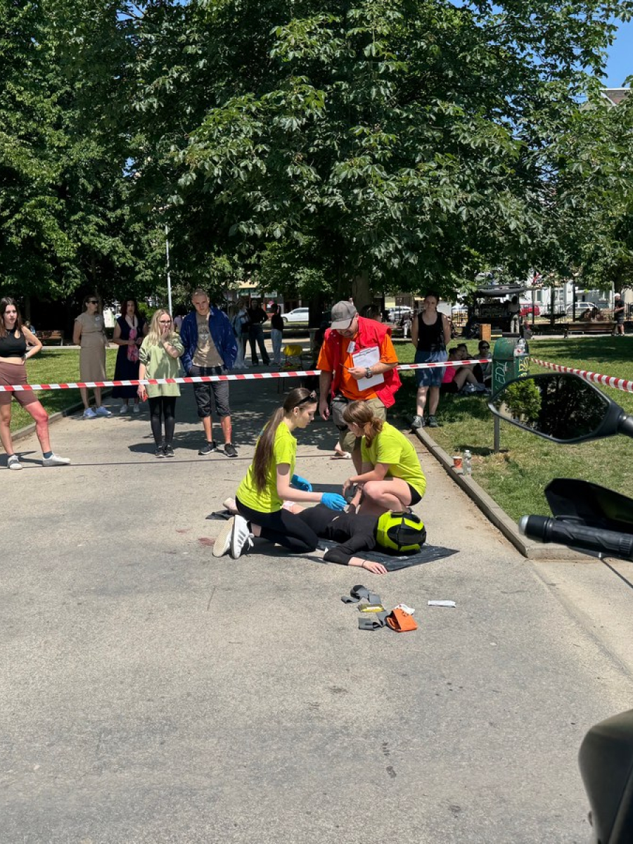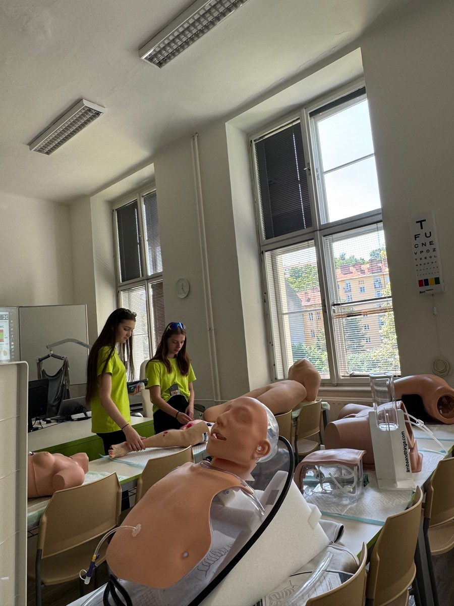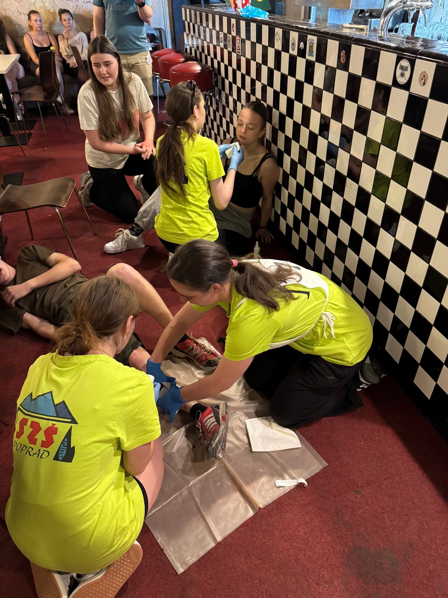 Súťaž preverila naše vedomosti aj praktické zručnosti – simulované zásahy v krízových situáciách vyžadovali rýchle rozhodovanie, tímovú spoluprácu a pohotové reakcie. Naše žiačky ukázali, že to zvládajú s prehľadom a odhodlaním. Na 5 stanovištiach poskytovali prvú pomoc raneným s otvorenou zlomeninou, tepnovým krvácaním, pri úraze el. prúdom, amputácii prstov, anafylaktickom šoku po uštipnutí včelou, dopravnej nehode s úrazom chrbtice, so zatvorenou zlomeninou ramena, pri zatvorenom pneumotoraxe, pri páde z rebríka pri práci v záhrade, pri vytknutí členka, pri úzkostnom stave, pri popálenine 1.stupňa a tržnej rane na brade, ale aj ranenému v bezvedomí.